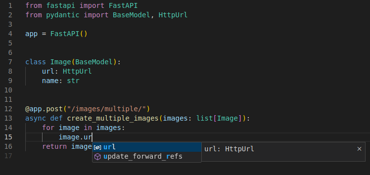 Por exemplo, no modelo Image nós temos um campo url, nós podemos declara-lo como um HttpUrl do Pydantic invés de como uma str: